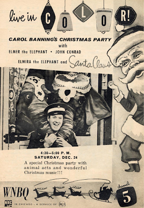 We start with this Saturday afternoon presentation on WNBQ, Chicago's NBC affiliate, starring Ned Locke as Santa. Locke was a Chicago television legend, "Ringmaster Ned" on WGN-TV's Bozo's Circus from 1961 to 1976. It also features John Conrad's Elmer the Elephant, the beloved Chicago children's character. It's notable for being the first all-live color program to originate from Chicago.