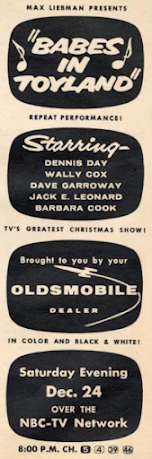 "Babes in Toyland," loosely based on the Victor Herbert operetta, was first shown to great acclaim in 1954; this is a repeat performance on Max Liebman Presents. But in 1955, a repeat performance means that it's being done all over again, live, and on Christmas Eve to boot. It's not the Laurel & Hardy version, but stars Dave Garroway as a Macy's Santa taking care of a lost girl until her mother can show up; in the meantime, he reads her the story of "Babes in Toyland." The performances, particularly by Garroway, are charming. Both the 1954 and 1955 broadcasts were preserved on kinescope and issued on DVD a few years ago; you can see the 1954 broadcast (the better of the two) here .