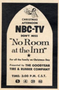Moving now from Christmas Eve to Christmas Day, "No Room at the Inn" is the inaugural presentation of NBC's His Way, His Word program, a series of four religious dramas, to be shown monthly on Sunday afternoons. There's nothing I was able to find on who stars in this special, but I'm sure there's one of you out there who can tell us more about it.