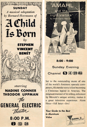 Why, oh why, did the networks do this to us? On Sunday night, it's NBC's annual presentation of Gian-Carlo Menotti's modern classic "Amahl and the Night Visitors," on The Alcoa Hour, versus The General Electric Theater's presentation of Bernard Hermann's "A Child is Born," based on the play by Stephen Vincent Benét. Fortunately for us (though it didn't do much good for viewers back then), they're both available; you can see "A Child is Born" here , while "Amahl," in addition to being commercially issued on DVD , can be seen here .