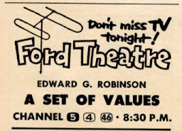 Thursday's episode of Climax, "Bail Out at 43,000" (7:30 p.m., CBS) has a well-known cast: Charlton Heston, Richard Boone, and future First Lady Nancy Davis, who in 1952 married Ronald Reagan. At 8:00 p.m., Dragnet has a New Year's episode; Joe Friday, attending a New Year's Eve party at the home of his partner Frank Smith, looks back about some of the most memorable cases of the past year. Mary Dean appears as Frank's oft-mentioned but seldom-seen wife, Fay. And Edward G. Robinson makes a rare television appearance in Ford Theatre as a former gangster trying to dissuade his son from following in his footsteps. (8:30 p.m., NBC)One of the things you might have noticed this week is that, aside from the NFL Championship on Monday, there's been very little sports, and in particular no bowl games. That's because all the bowl action comes next Monday, when six of the season's seven bowl games are played. Here's something on Friday, though: the final of the ECAC Holiday Festival college basketball tournament, live from Madison Square Garden in New York (9:00 p.m., NBC). For years, some of the best college teams from the East Coast Athletic Conference would take on powerhouse teams from the rest of the country in an eight-team tournament, with the winner sure to be a major contender for the national title. The Holiday Festival still exists, in a muted form, with two games played on one day and no overall champion, but in its day it was a game worthy of national television coverage. In the 1955-56 season, the great Bill Russell will lead undefeated San Francisco to the second of two consecutive national championships (and 55 consecutive victories); one of their wins comes in the Holiday Festival championship game, where they defeat UCLA 70-53.