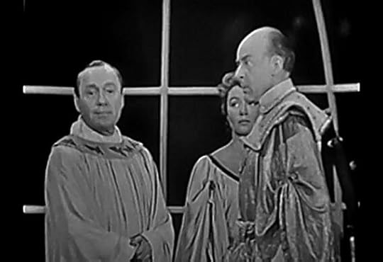 This revision, plus the toning down of some of the movie's comedic set pieces, adds a level of genuine poignancy to the story, not to mention providing us with a threat we can actually identify with. And when the story makes its way to television four years later, it is this version, not the one seen in theaters, that forms the basis for the teleplay, broadcast live on CBS's Sunday afternoon cultural variety show Omnibus and introduced by host Alistair Cooke, three days after Thanksgiving, 1953. That's not to say "The Horn Blows at Midnight" has become a straight drama; to the contrary, there are several funny moments, most of them centered around Benny's reputation for stinginess. For instance, while waiting in the lobby of the Waldorf for Danny to appear, a bellboy walks through the lobby "paging Jack Benny." The old woman sitting next to Athaneal comments that she always watches Benny's show (this is television after all, rather than radio) and adds that he must be "the sweetest, kindest, most generous man in the whole world." Athaneal also turns out to be a big tipper, giving the two shoeshine boys (one of them played by Harry Shearer!) a dollar each; "It's such a wonderful feeling to give money away," Benny says, with his trademark pause as he looks at the audience. And then there's the scene when a little girl at the Waldorf asks Athaneal how old he is; 357, he replies, but adds "I tell everybody up there that I'm 339," a play on Benny's perennially being 39.