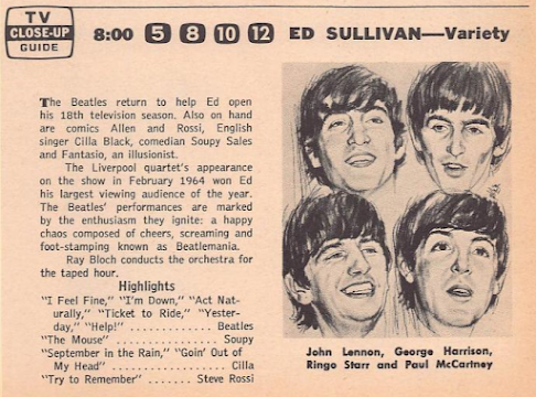 I'm blowing off the usual "Sullivan vs. The Palace" feature this week for two reasons: first, The Hollywood Palace is a rerun, with Roy Rogers and Dale Evans hosting, and we already looked at that episode here . More important, however, is the headliner for Ed's 18th season opener: The Beatles.