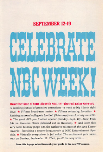 Here's something I thought might be a fun follow-up to Saturday's 1965-66 Fall Preview edition of TV Guide. It's an eight-page insert from that issue, advertising NBC's new fall lineup, which premieres during NBC Week, September 12 through 19. For those of you who don't remember, the networks used to roll out their fall lineups over the course of a week-long extravaganza. You'd get your first glimpse at new shows, the return of old favorites, and probably some blockbuster movies along the way. It was a great way to do business, and NBC Week ("NBC: The Full Color Network!") was one of the best of the promotions.