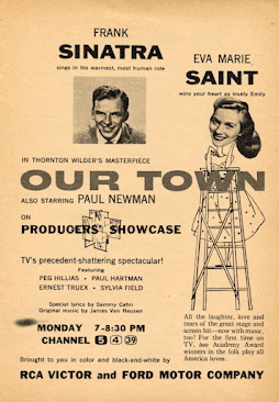 From one legend to another: Frank Sinatra says he has no interest in doing television on a regular basis—it's "too tough," he says—but the networks keep coming after him, and he's not above doing the occasional special, such as this Monday's now-famous Producers' Showcase presentation of Thornton Wilder's "Our Town" (7:00 p.m. CT, NBC) in which Sinatra plays the Stage Manager and introduces the song "Love and Marriage."* The cast includes Paul Newman and Eva Marie Saint, the two teenagers at the heart of the story, plus Shelley Fabares and well-known character actors Paul Hartman, Ernest Truex, Sylvia Field, and Peg Hillias.
