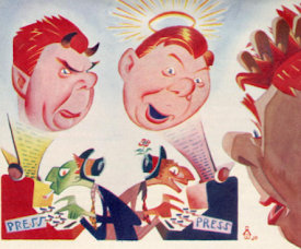 While acknowledging that "a few programs are not what they should be," Swayze points out that "our youngsters' TV experiences are in no way limited to specifically designed 'children's programs,' either good or bad; their interest isn't limited to programs tailor-made for their particular age group." Because of its visual impact and sense of immediacy, "televisison has captured the child's imagination and boosted interst in areas of thought and activity often considered outside his own sphere." In support of his contention, Swayze points to his own experience with News Caravan; more than 35 percent of the mail he gets is from children between six and 16, a "tremendous response" from a demographic that's not the target market. In one week, he received letters from an entire New Jersey elementary class commenting on world problems; had a letter from a 14-year-old in Arkansas asking about use of the H-bomb for defense; heard from a 15-year-old with her views on the power struggle in the Kremlin; and had a 10-year-old write asking for ideas on the president's foreign policy." Many colleagues, he reports, have received similar kinds of mail from young viewers; among other things, he concludes, "we parents are slow to realize how much youngsters are interested in what’s going on in the world beyond their own particular family and school realm."