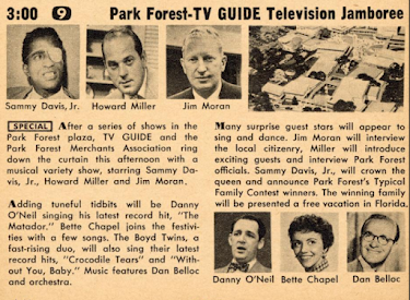 Throughout the week, the merchants of the modern Park Forest Plaza in Park Forest, Illinois ("60 modern stories! Parking for 3500 cars!") have been celebrating the "Park Forest-TV Guide Jamboree," and Friday features a musical-variety hour with local celebrities, headlined by a non-local celebrity: Sammy Davis Jr., who also crowns the queen of the festival. (3:00 p.m., WGN) In case you were curious, the