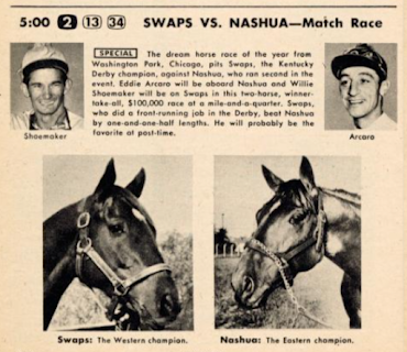 It isn't often that a horse race provides the lead story in TV Guide. It isn't often that a weekday afternoon sporting event, other than the World Series, becomes the most talked-about event of the week. But then, it isn't often that you see two horses like Swaps and Nashua, and therein lies the story.The California-bred Swaps won the Kentucky Derby in May, defeating Nashua, the "Pride of the East," by a length-and-a-half—a "convincing victory," according to Sports Illustrated. Yet Swaps' owner chose not to run him in the remaining Triple Crown races, returning instead to the West Coast, where the horse remained undefeated through the summer. Nashua, on the other hand, ran in, and won, both the Preakness and the Belmont Stakes; the Derby defeat to Swaps was his only loss of the year. The public, and the horse racing industry, clamored for a rematch between the two, to settle the question of which horse was the year's best.