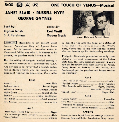 Musical comedy is always a crowd pleaser, and on Saturday Max Liebman Presents showcases 1943's "One Touch of Venus" in a live broadcast (8:00 p.m., NBC) with Janet Blair, Russell Nype, and George Gaynes. The music is by Kurt Weill with lyrics by Ogden Nash, and the book by Nash and S.J. Perelman; I think there are as many stars in the credits as there are in the cast. The TV production is generally considered superior to the movie version (you can see a clip of it