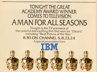 The highlight is Wednesday night's special presentation on NBC, the television premiere of 1966's Best Picture winner A Man for All Seasons (Wednesday, 8:30 p.m. PT), starring Oscar winner Paul Scofield as Sir Thomas More, who was martyred by the psychotic Henry VIII for refusing to recognize the king's divorce from Catherine of Aragon. The movie won six Oscars in total; Judith Crist calls it "a thinking man's spectacular," "a gripping human drama in which the passions and turbulence are underplayed, a probing study of conscience whose complexities and subtleties are indicated with brilliant clarity and whose contemporary significance is forcefully presented by implication alone." Interestingly, NBC plans to repeat the movie the following Sunday afternoon as part of NBC Week. I think I've mentioned this before, but this is a movie that took a long time to grow on me; I finally made the commitment a few years ago, and now it's part of my library; it is, indeed, a great movie.Among the movie repeats are a couple of successful pilots: Toma (Wednesday, 8:30 p.m., ABC), starring Tony Musante as the detective who's a master of disguise, and The Six Million Dollar Man (Tuesday, 8:30 p.m., ABC), with Lee Majors as the man-machine. Crist likes the first, but finds the second "somehow wholly unappetizing." Musante leaves Toma after one season, with the series then morphing into Baretta, while The Six Million Dollar Man thrives for five successful seasons, even generating the Bionic Woman spin-off.
