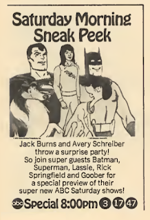 Friday night ABC and NBC air primetime specials touting their new Saturday morning lineups. ABC's Saturday Morning Sneak Peak (8:00 p.m.) is hosted by Jack Burns and Avery Schreiber, with Rick Springfield (Mission: Magic!), Lassie (Lassie's Rescue Rangers), and new offerings from Batman and Superman (Super Friends), Yogi Bear (Yogi's Gang), and Goober (Goober and the Ghost Chasers). Meanwhile, NBC Starship Rescue (8:30 p.m.) touts the new animated Star Trek, Butch Cassidy and the Sundance Kids, Go!, and appearances by Kevin Tighe and Randolph Mantooth (Emergency +4) and Johnny Whitaker, Scott Kolden, and Billy Barty (Sigmund and the Sea Monsters). CBS, not to be left out, has a repeat of Weird Harold, one of Bill Cosby's creations, featuring Fat Albert and more of his friends. I was pretty much over the Saturday morning scene by then, but these shows just sound painful to me. l l l