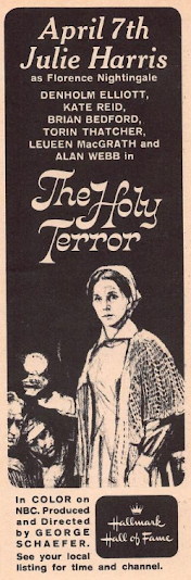 Wednesday features the season's final presentation of the Hallmark Hall of Fame, with Julie Harris starring as Florence Nightingale in "The Holy Terror" (7:30 p.m, NBC) with an outstanding supporting cast that includes Denholm Elliott, Kate Reid, Torin Thatcher, and Brian Bedford. Appropriately enough, Julie Harris is also profiled in this week's issue, with Robert Higgins writing that for all the success she's achieved on Broadway, in Hollywood, and on television, the actress remains a private, enigmatic person off-stage. "I’ve failed so many times as an actress," she tells Higgins. "I’m not an artist by any means. I don’t think I'll ever be one." Even today, considered one of America's finest actresses, she struggles with her own identity; powerfully shaped by an unhappy childhood which she overcame only by burying herself in her roles, she's only now starting to realize that there's more to life than work. And yet: "My family is as important to me as my life, but that doesn’t tell me who I am. Some people never do find themselves. But I, for one, have to go on trying." By the time of her death at age 87 in 2013, she had five Tony Awards, three Emmys, a Grammy, and an Oscar nomination to show for a brilliant career. And I'm not going to make any smart cracks about this being another example of how Hall of Fame used to turn out high-quality drama, although you can see for yourself in