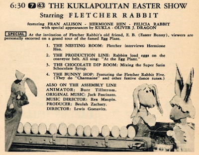 One of the day's highlights has to be The Kuklapolitan Easter Show (6:30 p.m., ABC), starring Fletcher Rabbit, with Fran Allison and the rest of Burr Tillstrom's Kuklapolitan puppets, plus a "special appearance" by Kukla and Ollie. It's an "egg-sighting" tour of the Easter Bunny's famous Egg Plant, and I think this would be a delightful show to see. The Hallmark Hall of Fame presents "Lydia" (5:00 p.m., NBC), with Sarah Churchill as a Greek pagan converted by the apostle Paul; there's also a special Easter show by Fred Waring and his Pennsylvanians on G.E. Theater (9:00 p.m., CBS) to round out the evening.l l l
