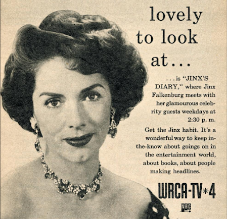 One other note: on Wednesday, Arlene Francis takes her Home show on the road (10:00 a.m., NBC) for its first color broadcast, from Washington D.C. ("under the cherry blossoms.") Highlights include girls from the Japanese Embassy showing off authentic costumes, a preview of the Mayflower Hotel spring fashion show, and a demonstration of the care of cherry trees. Things aren't all lightness and grace, though; Filmed overhead views of Washington's slums will be followed by Arlene showing scale models of plans for slum clearance. Lord only knows how well that turned out. We don't mention Home much except for the daily listings, but it's part of Pat Weaver's dawn-to-midnight programming for NBC viewers: Today, Home, and Tonight.