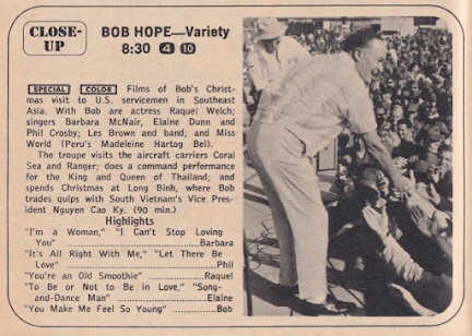 " piece reviewing Christmas programs, I mentioned Bob Hope's Vietnam Christmas show; it was kind of a tangential follow-up to the TV Guide of January 13, 1968, in which Hope talked about his overseas Christmas trips to entertain American troops, which he had been making since 1941. We skipped over his 1968 show and watched the 1969 edition as our final Christmas program of the season. (Personal choice; Ann-Margret over Raquel Welch.)People have differing opinions when it comes to Bob Hope; some of them think he's very funny, others not so much. Increasingly, the new generations don't even know who he is. There's no doubt that his humor comes from a different time, and his brand of joke-telling (along with the constant ogling of the beautiful women who populated his guest lineup) might play differently to newer and more tender ears.