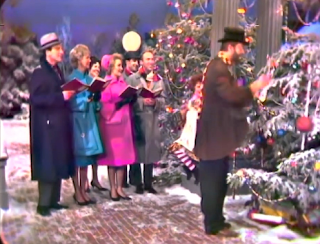 The Cowsills on Sullivan in 1967. Dig that white wreath! And so, as you make your way through the decades watching Andy and Bing and Bob Hope and Ed Sullivan and the rest, you see when white flocked trees were all the rage, or ones made of silver aluminum or pink plastic. You see pine garlands strung across downtown streets with lights in every store window and bells hanging from streetlights; you see families gathered around the piano singing carols. (And you see the United Nations Children's Choir, which appeared everywhere.) Again, not everyone experienced this—maybe most people didn't. But it wouldn't have seemed out of place for them to see it on TV.Speaking of color, by the mid 1960s many of these shows are being taped in color, and the art directors know how to make the most of it. I have no idea if people in the Victorian era dressed as colorfully as they do in the specials that try to recreate the feel of a Charles Dickens Christmas, but the palettes in these specials look absolutely wonderful. Not all of these shows survive in color, but enough of them do to remind us of how special color television was back then, how vivid the colors were and how they popped right off the screen. There probably wasn't anything comparable until high definition came along. And the sets—the detail, or the illusion of detail created by the set designers—brought back the hum of a midcentury Christmas in the city, with store windows decorated for Christmas and shoppers crowding the sidewalks. It's something that Gen Z probably wouldn't get (and wouldn't care about), but this is the Christmas I grew up with, and there's something special about seeing it, whether you're watching Andy Williams, Red Skelton, Tennessee Ernie Ford, or The Bell Telephone Hour.