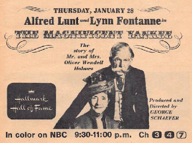 Leonard Bernstein returns with another Young People's Concert on Thursday (8:00 p.m., CBS), highlighting young artists. A couple of artists who are not young, but are quite distinguished, are the husband-and-wife team of Alfred Lunt and Lynn Fontanne, two of the greats of the stage, who make a rare TV appearance as the stars of the Hallmark Hall of Fame production of "The Magnificent Yankee" (9:30 p.m., NBC), the story of Supreme Court Justice Oliver Wendell Holmes. Somewhere in-between is David Susskind's Open End (9:00 p.m., KVIE), with "Seven Beautiful Airline Hostesses" discussing their "glamorous—and at times difficult—jobs."Friday night, Bob Hope's Chrysler Theatre (8:30 p.m., NBC) tells the story of "The Loving Cup," in which a yachtsman racing in the America's Cup needs to contact his former wife's flame to raise the financial backing. I find these kinds of stories fascinating, in that how-many-times-has-this-happened-to-you way; it seems as if men are always being forced to seek out rivals for their wife's affection because they need money. Isn't there anyone else around they can borrow money from? Like a bank? Either that, or the population of this country is much smaller than I thought, with about a two-degree separation between a man, his wife, her former flame, and financial security. What are the odds? I mean, what are the odds?