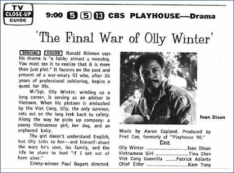 Sometimes—perhaps most times—even when you're able to watch a program from 50 or 60 years ago it can be difficult to recapture the impact that show must have had on viewers at the time. After all, times change, people change. Take, for instance, Sunday's episode of CBS Playhouse, the network's successor to the fabled Playhouse 90*. Set in 1963, "The Final War of Olly Winters" stars Ivan Dixon as an Army sergeant serving as a United States military adviser in South Vietnam at a time before American soldiers had been committed to combat.