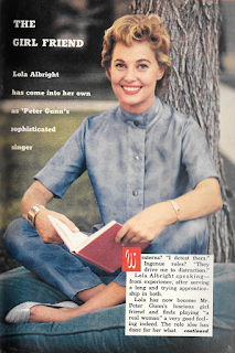 There are different ways to describe women, and to prioritize one is not to deny the others: beautiful, attractive, alluring, cute. There is no wrong answer; all of them are good. The way to describe that picture of Lola Albright below is cute. As I said, no wrong answer.Lola Albright is the costar of Peter Gunn, playing Edie Hart to Craig Stevens' Pete, and she says she appreciates the chance to play "a real woman." I've written before about Peter Gunn , one of television's "jazz detectives" of the late '50s and early '60s, and one of the points I try to emphasize is that the relationship between Pete and Edie is one between two adults, something you don't see too often anymore in a world populated by thirtysomething adolescent snowflakes. But what does that actually mean? I don't think I could describe it any better than she does: