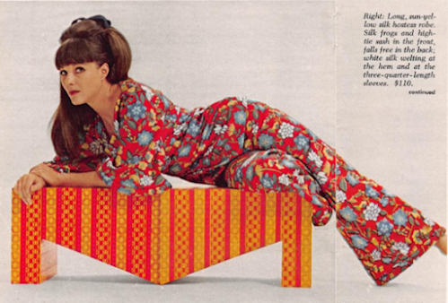Here she is modeling the latest from the summer collection of Dynasty of Hong Kong, with a decidedly Oriental accent. Wonder if she wore anything like this while Ben was filming The Killing of a Chinese Bookie? Yes, I know that was made ten years after this, but it's still a good thought.