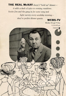 Here's a promising start: an ad on the inside cover (labeled page 2) for Jim McKay's 15-minute WCBS variety series, The Real McKay.You might know that Jim McKay's real name is Jim McManus; in fact, his son Sean, who is chairman of CBS Sports, uses the family name. And it might have been ABC's Wide World of Sports with Jim McManus, had it not been for this show.* The title is, of course, a pun on "The Real McCoy," and it was to be young McKay's first break in big-time television. He wasn't thrilled to find out that his name would now be McManus; "I liked my own name just as it was," McKay wrote in his autobiography The Real McKay. "The thought of James K. McManus disappearing into thin air didn't please me at all, and I knew would be even less pleasing to my parents, and to [wife] Margaret, who had easily taken to the liquid sound of my real surname." He quickly realized, however, that there was no sense in jeopardizing his chances, and so, though he wondered "why they didn't just call me Jim McCoy," Jim McKay it was, and would remain, for one of the legendary careers in television.