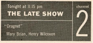 Then there are the shows that aren't starting up until later in the season. That movie on Channel 2, for instance, isn't for the Dragnet that we know and love. (Besides, Henry Wilcoxon is no Jack Webb.) But the famed cop series is on the way; Dragnet, with Joe Friday and Frank Smith* patrolling the streets of Los Angeles, makes its television debut on December 16, 1951, alternating every other week with Gangbusters. *Barton Yarborough, who had played Friday's partner Ben Romero on the radio version of Dragnet since 1949, died after two episodes of the television series had been filmed. After a short time working with several other partners, Smith (Ben Alexander) became Friday's partner for the remainder of the series.