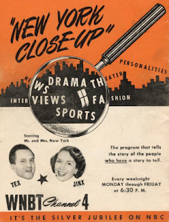 One more story I wanted to get to, and that's the show advertised on the back cover: New York Close-Up, Monday through Friday at 6:30 p.m. "The program that tells the story of the people who have a story to tell"—don't you appreciate the urgency that conveys? The show is hosted by the inimitable married couple of Tex McCrary and Jinx Falkenburg, and in the day they were a media sensation. "Mr. and Mrs. New York," indeed. They were pioneers in the talk show format, just as Dave Garroway was with Today, and like Garroway they are mostly forgotten today.Tex McCrary had not only been a correspondent during World War II, he was also a colonel in the Army Air Corps who led the first journalists into Hiroshima after the bomb. Jinx Falkenburg was considered one of the most beautiful women of her time: cover girl, athlete, USO entertainer. That nightgown that Rita Hayworth wore in her famous pinup ? That was loaned to her by her friend, Jinx. I imagine it looked just as good on her.