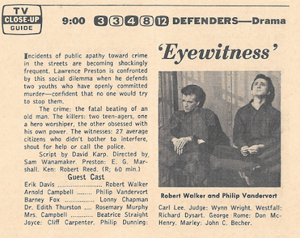 On Thursday night, CBS' legal drama The Defenders presents "Eyewitness," in which E.G. Marshall defends "two youths who have openly committed murder—confident that no one would try to stop them." The "no one" includes 27 witnesses, "average citizens who didn't bother to interfere, shout for help or call the police."