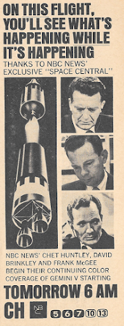 While it's true that the Gemini V flight was an important step in the journey to the moon, it's still remarkable that the networks are providing so much coverage; Fred Friendly would later complain about what he called "an escalation just like the arms race," and said that with the exception of a manned flight to the moon, CBS would "no longer begin telecasting manned spaceflight coverage 'any earlier than a half-hour before launch.'" For Saturday's rescheduled launch, CBS would begin coverage at 8:30 a.m., 2½ hours later than NBC and 1½ hours after ABC. Setting aside the ridiculous way the all-news networks deal with even the most minor news story, can you imagine many events getting this kind of airtime today?