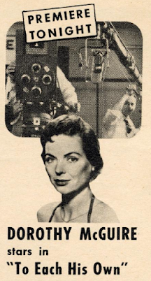 The Fall Preview issue doesn't come out until September 25, but some of our favorite stars are getting a head start on the new season. Perry Como returns with his 15-minute, thrice-weekly program (6:45 p.m., CBS), as is Eddie Fisher's show (Wednesday, 6:30 p.m. NBC). Life With Father returns at 9:00 p.m. Tuesday on CBS; did you know that one of the stars is Marion Ross? You probably did; I'm always among the last to know. Dragnet's season premiere (Thursday, 8:00 p.m., NBC) puts Friday and Smith on the trail of someone pushing "objectionable material" in a high school; I'll bet it doesn't depict two people kissing, which is probably why it can be shown on TV. Also on Thursday, Lux Video Theater debuts its new one-hour format after four seasons of half-hour dramas, as Dorothy McGuire stars in "To Each His Own" (9:00 p.m., NBC), a story of a woman dealing with tragedy from World War I. And on the local scene, which in this case means Chicagoland, The Howard Miller Show returns on Friday night for two hours of music and guest stars (11:00 p.m., WBBM).The Teletype notes that September 11 will see the first-ever broadcast of the Miss America Pageant, with John Daly emceeing the broadcast (Bob Russell hosts the actual pageant). By contrast, the last pageant was streamed only. The following month, the premiere of CBS's action series Climax (airing October 7) will be Raymond Chandler's The Long Goodbye, featuring Dick Powell as Philip Marlowe. Having played Marlowe in the big-screen Murder, My Sweet (and then in two radio adaptations of the same story), Powell becomes the first actor to play Chandler's iconic detective multiple times; to my mind, he remains the definitive Marlowe.