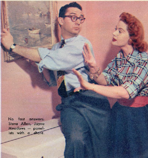 You may remember how Mac Davis had a hit song back in 1980 called "It's Hard to Be Humble," and if you're one of those unfortunates who have that problem, all you have to do is look at the life of Steve Allen, and you'll develop, as I have, an instant inferiority complex. Wonder why? "He's a panel stalwart on What's My Line; the star of a critic-caressed late-night New York variety show NBC plans to give nightly coast-to-coast showcasing effective September 27 [that would be, in case you're wondering, The Tonight Show]; a writer of TV dramas; a composer of song hits; an aspiring novelist." Not only that, he turned down the opportunity to host Talent Scouts in the event the show's current host, Arthur Godfrey, decides not to return in the fall. Oh, and did I mention he just got married last month, to the charming Jayne Meadows? Not only does his career make me feel inferior; I now feel as if I should have written a better paragraph describing all this; punchier, more fitting for a man of his accomplishments.
