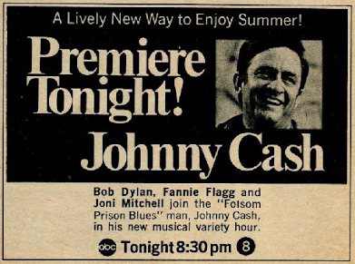 Also on Saturday: it was a couple of weeks ago that I wrote about the "wedding of the year" on Mister Peepers, and mentioned other big TV weddings, but here's one I neglected: Max and Agent 99 on Get Smart (7:00 p.m., NBC). I really did think that killed the show, but then what do I know? Best to opt for the debut of The Johnny Cash Show, the summer replacement for The Hollywood Palace (8:30 p.m., ABC). On this premiere show, Johnny's guests are Bob Dylan, Joni Mitchell, Doug Kershaw, and Fannie Flagg. His regulars are June Carter and the Carter Family, Carl Perkins, the Statler Brothers, and the Tennessee Three. Not bad, not bad.Leaving aside the Emmys, the most interesting thing about Sunday might be that tonight's Smothers Brothers Show (8:00 p.m.) is the last show of the series, CBS's patience having finally run out. Beginning next week, Hee Haw, a country variety show, debuts in this time spot. Including its 23 seasons in first-run syndication, the Kornfield Kounty rubes stick around until 1993. Of personal interest, The Frank McGee Report (4:30 p.m., NBC) covers the Minneapolis mayoralty race, between conservative independent Charles Stenvig, running on a law-and-order platform, and liberal Republican Joe Angotti. I remember this election well; we had a Stenvig sign on our lawn, and he would win the first of his three terms as mayor, before being defeated by Democrat Al Hofstede. To date, Stenvig is the last non-Democrat mayor of Minneapolis, and that may explain a lot.