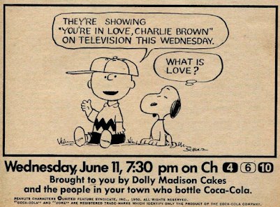 Wednesday, and another one of those Charlie Brown specials that didn't really catch on, not like Christmas and the Pumpkin: You're in Love, Charlie Brown (7:30 p.m., CBS). This is, according to the always-reliable Wikipedia, notable in that it is the first television appearance of Peppermint Patty, who would eventually come to take over a good part of the storytelling in the strip. This Peanuts cartoon aired six times on the network. That's followed by a repeat doubleheader from Hooterville: at 8:00 p.m. on CBS, The Beverly Hillbillies head there to celebrate Thanksgiving with those folks from Petticoat Junction and Green Acres; next, Petticoat Junction's Uncle Joe crosses over to Green Acres as part of Hooterville's centennial celebration. If only they could have done a Petticoat Junction episode with someone from one of the other two shows—but no, it's time for Hawaii Five-O next, and there's no crossover from anything there.A couple of great variety show lineups stand out on Thursday; This is Tom Jones (8:00 p.m., ABC) features Mama Cass Elliot, the Dave Clark Five, George Carlin, and Spanish singer Massiel; The Dean Martin Show (9:00 p.m., NBC) welcomes Lena Horne, Sid Caesar, Victor Borge, and the comic Times Square Two.