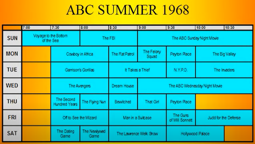 The other night we were watching a YouTube video of ABC's 1968 summer schedule, with the openings to all of their shows, and a programming grid at the end. You know the kind, right? We'd seen this one before, as we have with most of them; it's the type of video that's easy to have on in the background, without having to concentrate too much or take your eyes off what else you might be doing. Like having dessert, for instance, which just happens to be what we were doing at the time.At some point in the proceedings, though, my wife turned to me and said, "Look at how many of these shows we've got. We've seen most of them!" I started thinking about that, not only the ones we've got on DVD, but those we've started watching on various YouTube channels. It occurs to me that the 1968 season must be close to the tipping point at which a majority of TV series still exist, either on DVD, the gray market, or through YouTube. It would certainly be a contender for the 1960s season having the most shows; the Golden Age of DVD releases was very kind to this era. (Going to all-color programming didn't hurt, either.)