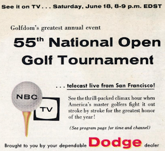 I don't often lead with a sports item, but sometimes relevant news is hard to come by in these issues from the mid-1950s, and in this case we've got a truly notable event in store: the 1955 U.S. Open golf championship. (Saturday, 6:00 p.m. CT, NBC) If that doesn't sound like a reason to get worked up, just wait for the story behind the headline—or the listing, as it was.Ben Hogan was already a legend in 1955. A movie had been made about his life, starring Glenn Ford; he owned a successful company that manufactured top-level Hogan golf clubs; he wrote a best-selling golf instruction manual that is still considered a classic today; he received a ticker-tape parade in New York after winning the British Open in 1953; and he had earned the admiration of everyone after successfully coming back from a catastrophic auto accident in 1949 that had nearly killed him. Coming into the 1955 Open, he was seeking to become the first man to win five U.S. Open championships. Sports Illustrated's Open preview was entitled, "The Age of Hogan."