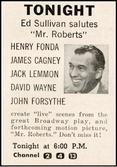 Speaking of spectaculars though, Gleason is matched by Ed Sullivan, whose Toast of the Town show (Sunday, 6:00 p.m., CBS) devotes the entire hour to the stage play and movie Mister Roberts, celebrating its seventh anniversary on Broadway (and soon to be a major motion picture). The star-studded lineup, recreating scenes from the stage and screen versions, includes the original Roberts, Henry Fonda; the stage and movie versions of Ensign Pulver, David Wayne and Jack Lemmon; and the movie's Captain Morgan, James Cagney. Stage producer Leland Hayward and movie producer-director Mervyn LeRoy are on hand as well. We don't have a rival variety show to compare to Ed this week, but with that list of stars, it wouldn't have mattered. John Henry Faulk, soon to be embroiled in the blacklist controversy, is the substitute host for Jack Paar's weekly morning show (M-F, 7:00 a.m., CBS). As for primetime, it's the last show of the season for Sid Caesar (Monday, 6:00 p.m., NBC), and, as with Jackie Gleason, the whole gang's on hand—Nanette Fabray, Carl Reiner, Howard Morris, Virginia Curtis, and Ellen Parker. Bill Hayes, who's part of the upcoming summer replacement series, is tonight's special guest.