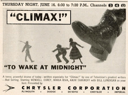 We all know that Rod Serling was a prolific writer for television long before The Twilight Zone, and on Thursday's episode of Climax (6:30 p.m., CBS), Wendell Corey, Akim Tamiroff, and Maria Riva star in Serling's "To Wake at Midnight," with a typically provocative storyline: "All the pent-up prejudices and hatreds of postwar Europe are revived when a Nazi lieutenant recovers consciousness in a British hospital after being in a coma for years."There were, I think, four great police series of the 1950s that incorporated their setting as a virtual character in the program: Dragnet (Los Angeles), M Squad (Chicago), Naked City (New York), and The Lineup (San Francisco). And it is the last that we look at on Friday (8:00 p.m., CBS), in the last show of the season. It's not particularly different from the other three; it's not quite as—documentarian?—as Dragnet, but it's a serviceable, enjoyable series that runs for six seasons, three of them in the top 20, and has a likeable cast in Warner Anderson and Tom Tully. Like their L.A. counterparts, The Lineup became a pretty good big-screen movie in 1958, although, unlike Dragnet, in black-and-white.
