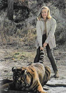This week's starlet is our comely cover girl, 24-year-old Cheryl Miller (that's her on cover right, not to be confused with Judy the Chimp), one of the stars of CBS's series Daktari. She talks with Dwight. Whitney from Africa U.S.A., the setting at which Ivan Tors' latest animal drama is being filmed, and it's clear that Cheryl's what we would today call an animal whisperer. Or at least that's what I gather from her exchange with a 425-pould Bengal tiger called Sarang, whom she cuddles and caresses until the tiger begins licking at her throat. She's a girl of many traits: she sings, was on the track team in school, flies jets, rides horseback, skis, and climbs mountains. When she's not doing all of that, she's also making personal appearances; "If you need a Miss Christmas Seal or a marshal to decorate your parade, or a pretty-fundraiser for the Junior Foundation for the Blind, Cheryl is always available." At times, it almost seems as if she looks at acting as an afterthought. After Daktari ends in 1969, she continues to appear in television up until 1980. Today, the only Cheryl Miller most people probably know of is the former basketball player. Somehow, I'm not so sure this Cheryl Miller would mind.