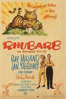 Based on the novel by H. Allen Smith (one of the finest humorists of his time), Rhubarb tells the story of an orange feral cat with a nasty disposition who's "adopted" by a wealthy businessman, T.J. Banner (Gene Lockhart, whom you might remember as the judge in Miracle on 34th Street). Banner, who's constantly surrounded by "yes" men, admires how the cat treats everyone with distain, rich and poor alike. This cat, he says, has spirit. He's a fighter, and if there's one thing T.J. Banner has always admired, it's a fighter. T.J.'s greedy daughter Myra thinks he's crazy, but his public relations man, Eric Yeager (Oscar-winner Ray Milland), affectionately tolerates the old man. It was Eric who was assigned to capture the cat from the golf course where he lived (stealing golf balls off the greens), and when Eric finally succeeds, he has the scratches to prove it.