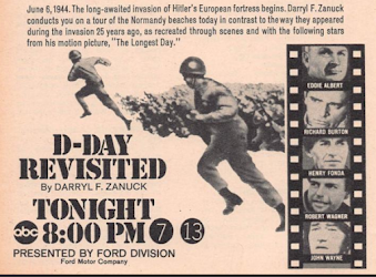 Back on June 1, ABC had a special called D-Day Revisited, hosted by movie mogul Darryl F. Zanuck, who returned to the beaches of Normandy, where he filmed his epic The Longest Day in 1962. Zanuck provided commentary on the battles of that monumental day, accompanied by clips from the movie.