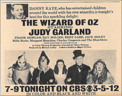 No "Sullivan vs. The Palace this week; usually, it's because ABC's found some reason or other to bump The Hollywood Palace, but this time it's CBS', fault—Ed makes way for the network's annual showing of The Wizard of Oz, hosted by Danny Kaye, at 7:00 p.m. It's easy to forget that in the days before DVDs and VCRs and all-movie cable channels, the showing of a movie like The Wizard of Oz could be quite an event. In its early broadcast years, it was shown as part of pre-Christmas festivities, but starting in 1964 it was moved to January, which is where it is this year. I was surprised to learn, in a somewhat jumbled and repetitive article from
