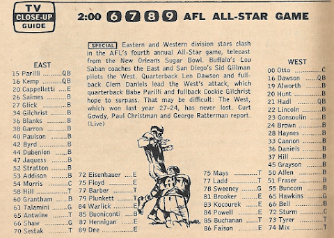 Eventually, the twenty-one black all-stars—supported by many of their white teammates—voted to boycott the game if it remained in New Orleans. Panicked league officials, with little time to do anything else, were forced to act quickly. On Monday, January 11 - only five days before the game - AFL Commissioner Joe Foss announced the game was being moved to Houston. It was too late for TV Guide to do anything about it, but the Close-Up remains a reminder of the climate of the times, and of how long it took some things to change. I wonder how the announcers on the telecast addressed the situation?