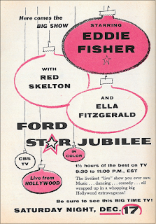 A couple of weeks ago I mentioned that not every program has to be Christmas-themed in order to be the kind of special that's only shown at special times of the year. Just check out this ad for Saturday's Ford Star Jubilee (8:30 p.m. CT, CBS), with Eddie Fisher, Red Skelton, and Ella Fitzgerald. (Oh, and Nat King Cole makes an appearance, too.) There are a couple of Christmas pieces in the 90-minute program, but for the most part, it's just songs. And I'll bet it was a pretty good show, too. It does prove one thing, though: if it's near Christmas and you're showing a special, just throw some decorations on the ads. It never fails.Sunday is where it really starts to look a lot like Christmas, starting with the afternoon program Wide Wide World at 3:00 p.m. on NBC. During the 90-minute program, host Dave Garroway takes us around the world to see how different cultures celebrate the season, including choirboys singing hymns in Quebec and New York, decorations at the Tropicana night club in Havana, the Posada Christmas processing in Mexico, and decorated department store windows in New York, Dallas, Minneapolis-St. Paul, and Washington.* A little after an hour into the program, they'll cut away for live coverage of President Eisenhower lighting the White House Christmas tree, from his home in Gettysburg.