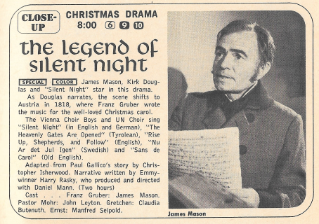The house we currently live in was built in 1961, which means that it's quite likely whoever was living here in 1968 watched several of the shows in this week's issue. That gives me a warm feeling, and not just because it's Christmastime, although this is one of my favorite issues. It's that there's some kind of a—I don't know, maybe it's a sense of uniting the past and the present in a way that we don't usually experience here. Were I reading this issue in the apartment we lived in back in Minnesota, a building less than 20 years old, it wouldn't have the same effect, I don't think. Or maybe the season's just making me feel sentimental. Who knows?When I owned this issue, we were living in a rented bungalow in Minneapolis, a few miles away from the scene of the riots last year. It was a different neighborhood then, of course, and a different time. I remember laying on the floor in the living room, playing with some of the toys I'd gotten, and watching The Legend of Silent Night (Wednesday, 8:00 p.m. CT, ABC). I'm not sure what attracted me to this special; I didn't know either Kirk Douglas or James Mason from Adam, and while I've come to appreciate "Silent Night" over the years, back then it wasn't my favorite Christmas song. (It didn't mention Santa or presents, after all.) It could have been because of the epic suggestion implied in the title, or just the distinctive typeset used in the closeup.
