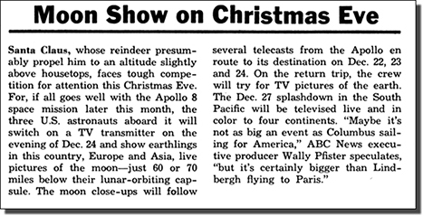 In a two-page spread providing details of the flight and the television coverage, Stu Samuels noted that a Christmas Eve broadcast from the moon was scheduled, beginning at 8:27 p.m. Eastern time (assuming the launch went off on schedule). The astronauts, having been briefed on the broadcast schedule, had, between themselves, prepared something they hoped would be appropriate, even healing, for those watching back on Earth.