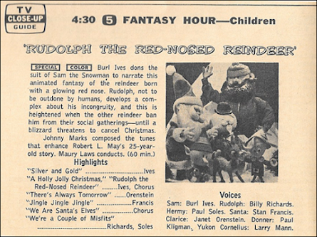 I have a friend who, for the last 30 years without fail, has called me on November 1 to leave a message on my voicemail: "Let the holidays begin!" For him, it was the best time of the year; putting pumpkins and haystacks on the doorstep, other decorations throughout the house, and before long it would be Thanksgiving, and then Christmas, and then New Year's. Yes, it is the best time of the year.I'm not quite as quick on the draw as my friend is; for me, it starts to sink in on Monday of Thanksgiving week. But there's no doubt that by the time we reach the December 5 issue of TV Guide, the holiday season is in full swing, and our television programming reflects it. There's not a lot this week, but what there is is big time, beginning with the very first airing of Rudolph the Red Nosed Reindeer, on Sunday afternoon's General Electric Fantasy Hour* (4:30 p.m. CT, NBC). The debut is accompanied by a full-color feature story with color pictures; in it, we learn that each figure cost upward of $5,000 to make, and it took 100 technicians and 22 room-sized sets to make the 25-year-old song into a reality. Even an eyebrow out of place could cost the production a week's worth of expenses to reshoot.