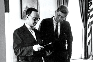 Arthur Schlesinger with JFKFrom here, Schlesinger takes up the question of how television got this way. The traditional argument, of course, is that it's a medium that simply gives the public what it wants, but Schlesinger points to the argument made by Gilbert Seldes, TV host, occasional columnist for TV Guide, and director of the Annenberg School of Communications at Penn.* Seldes says the question that should be asked is this: if TV is, in fact, simply giving the public "what it wants," how did the public get that way in the first place? And does the public even know how good television can be? How can it, when network executives refuse to demonstrate it to them?*The TV Guide connection is no surprise, given that Walter Annenberg is the magazine's publisher.