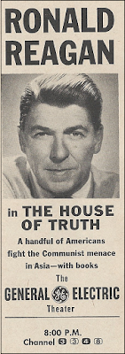 Meanwhile, speaking not of current but of future presidents, a brief note on my favorite ad of the week. It's the one on your right, for General Electric Theater (Sunday, 8:00 p.m., CBS—it really is a terrific day for television, isn't it?) and "The House of Truth," starring host Ronald Reagan in the story of how a library in Southeast Asia leads the fight against Communism. It's good to know that even back then, over 20 years before becoming president, he's fighting the war against the Commies. And by the way, Ronald Reagan, needless to say, was no fan of Arthur Schlesinger.l l l