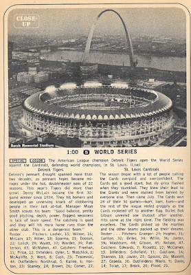 Despite all this, the big story of the week is the World Series between the defending champion St. Louis Cardinals and the Detroit Tigers, commencing with Game 1 Wednesday afternoon in St. Louis (1:00 p.m., NBC). The 1968 World Series is a milestone for many reasons, foremost being the last to be held before the start of divisional play the following season. For the last time, the American and National League champions would face off without having to go through a playoff series first—it would be good enough merely to finish with the best record in the league. This presents a unique, never-again-to-be-repeated World Series preview on Saturday's Game of the Week (1:00 p.m., NBC), with cameras shuttling between the Astros-Cardinals and Senators-Tigers games. There's nothing left to settle, with the pennant races long over and the two teams just waiting for Wednesday, and if you think that sounds boring, then you've put your finger on the reason why both leagues introduced playoffs the following year.The 1968 Series is one of the last to be played entirely in daytime (the first night game is introduced in 1971), and in this "Year of the Pitcher" it is the last to take place before the pitching mound is lowered and the strike zone redefined. As befits this year of superior pitching, two other accomplishments which haven't been duplicated since: in Game One, Bob Gibson strikes out 17 Tigers to set a World Series record, and in Game Seven Mickey Lolich becomes the last pitcher (to date) to start a Series game on two days' rest. Today's pitchers require four, and sometimes five, days' rest between starts; Lolich pitches three games in eight days, going the distance all three times, winning all three games. These guys today are such wimps!