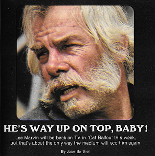 , in which his interviewer had barely any chance to say anything. Now Marvin's a big star; an Oscar winner for Cat Ballou, with the highly-anticipated (!) musical Paint Your Wagon coming up. This week he's in TV Guide for the network television premiere of Cat Ballou, and we asked ourselves: could this interview possibly be anything like the other one?"What has TV Guide ever done for me?" it starts out. "I never had a cover in TV Guide; all the crocodiles and dancing bears and honeysuckle farm boys got the covers. All those big stars of TV, and where are they now, baby? Where are they now?